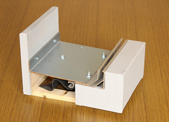 3、 摆上铝合金基座,内侧拧上M5园头自攻螺钉、外侧拧上M6螺帽。完成后如图3所示形状。
